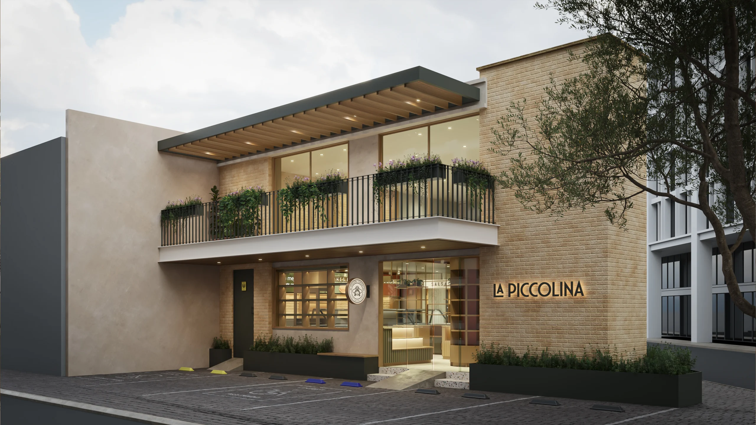 Piccolina es un proyecto de diseño arquitectónico e interiorismo comercial inspirado en el estilo toscano italiano, donde la fachada combina fachaleta de barro Ajalpan, microcemento en tonos claros, vegetación natural y vigas de madera que transmiten un carácter artesanal y cálido. En el interior, destacan el mobiliario de encino a medida, el piso de terrazo, los refrigeradores en madera y los plafones con vigas, creando un espacio acogedor y contemporáneo que fusiona tradición y arquitectura moderna.